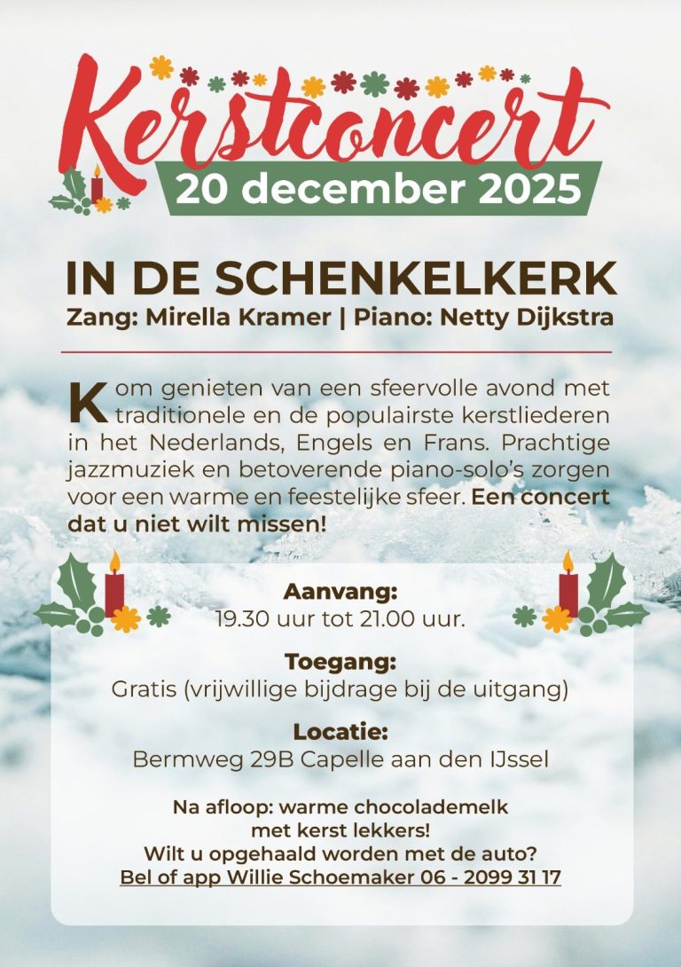 Zaterdag 20 december a.s. is er een kerstconcert in de Schenkelkerk met een gevarieerd programma.
